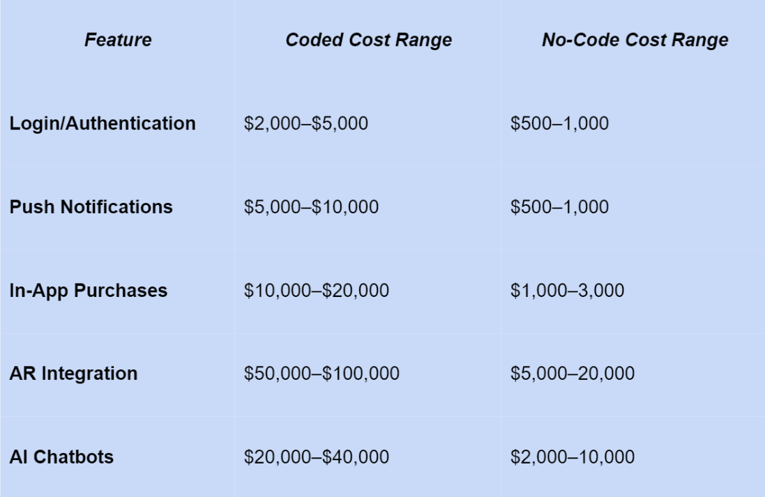 Advanced features like AI chatbots or AR are 2x-5x cheaper to implement with no-code platforms compared to custom coding.