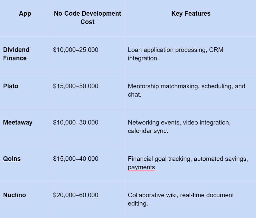 Examples like Meetaway and Qoins show how no-code apps can achieve significant functionality for under $50,000.